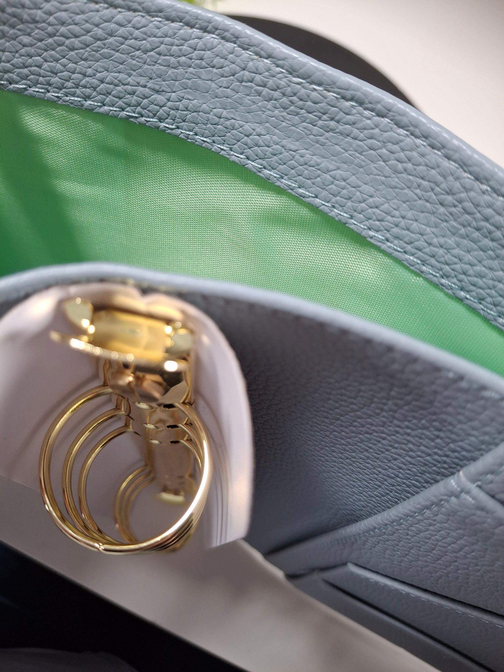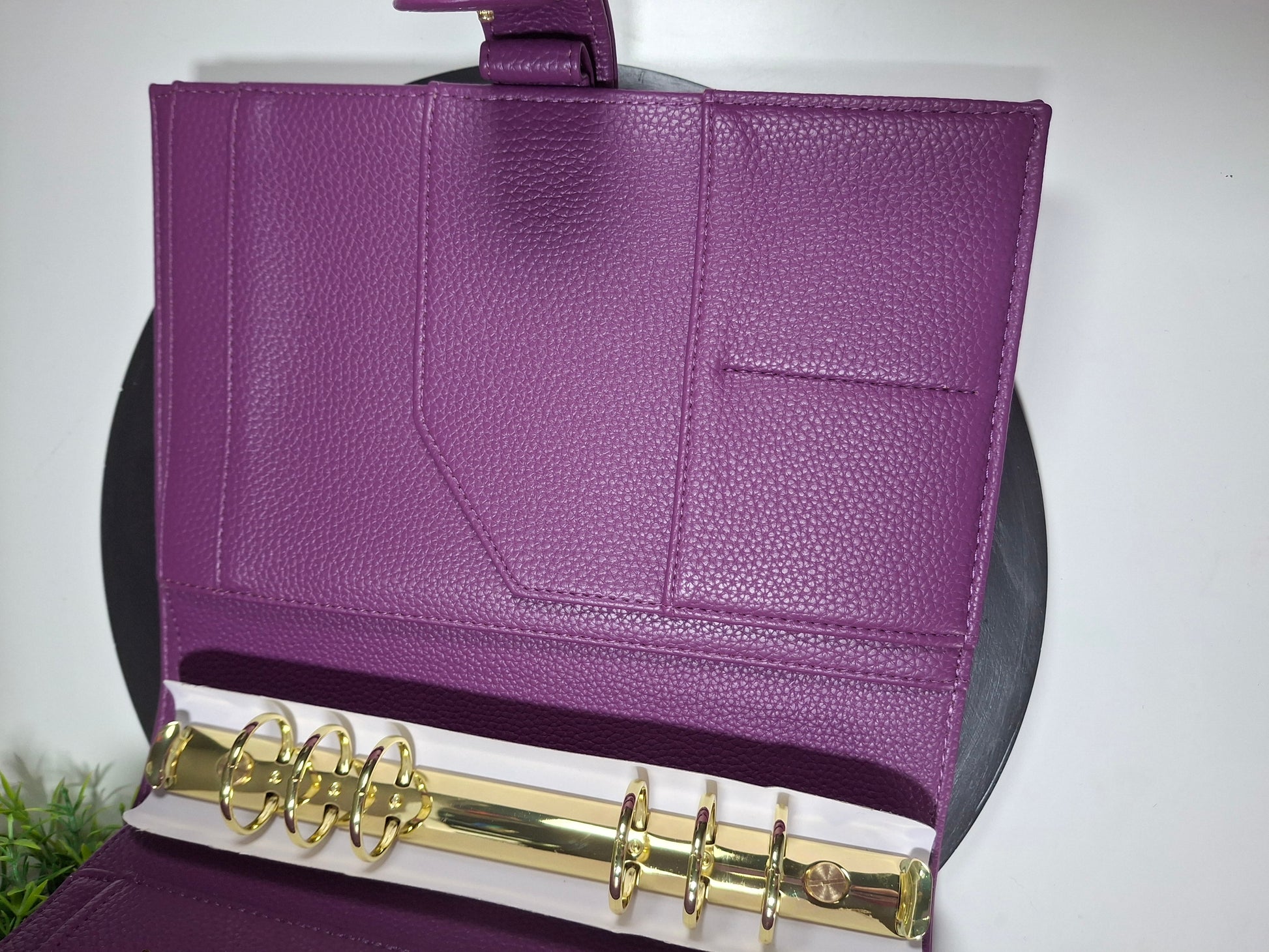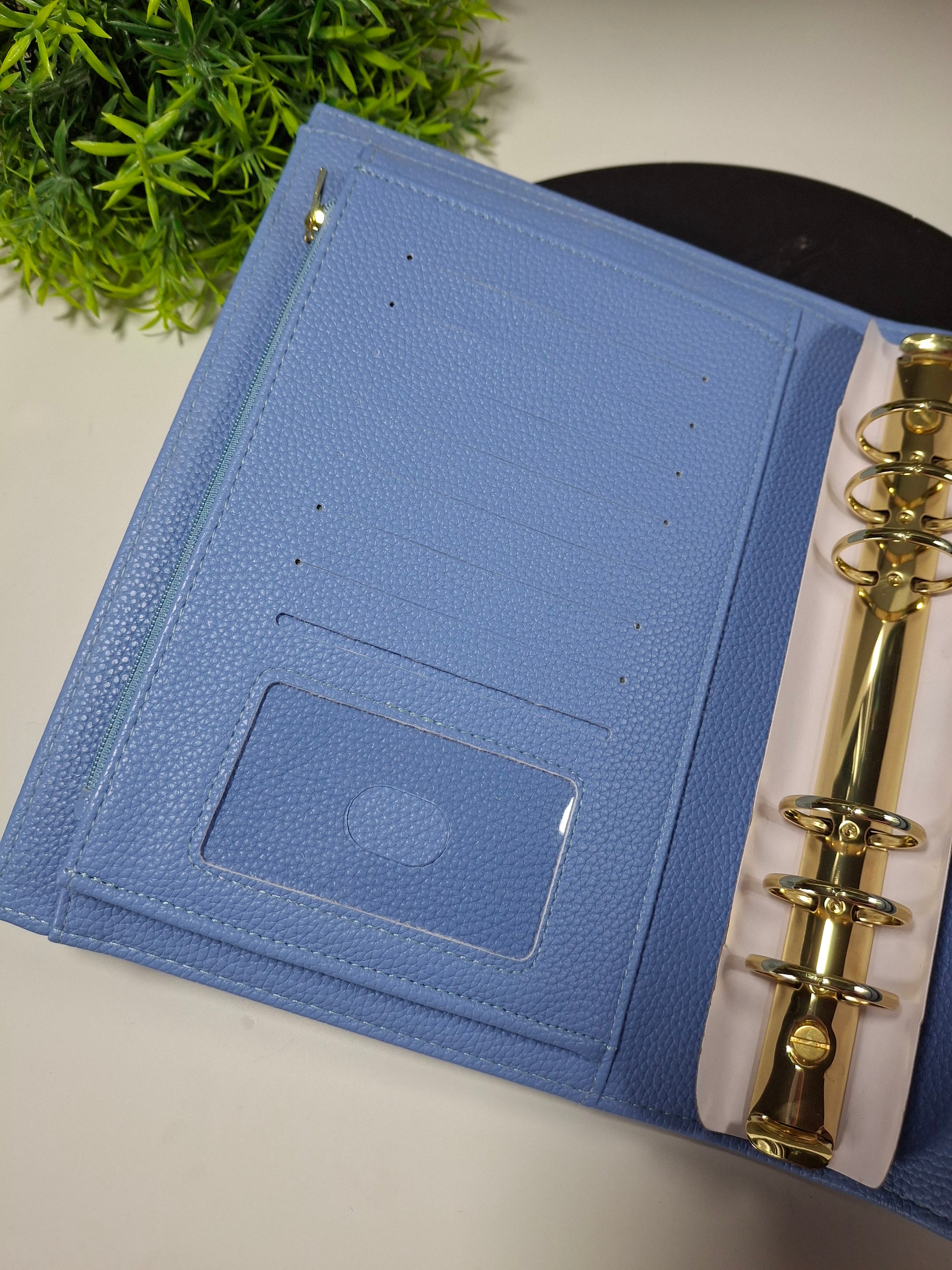 A5 pebble cover binder with gold hardware.