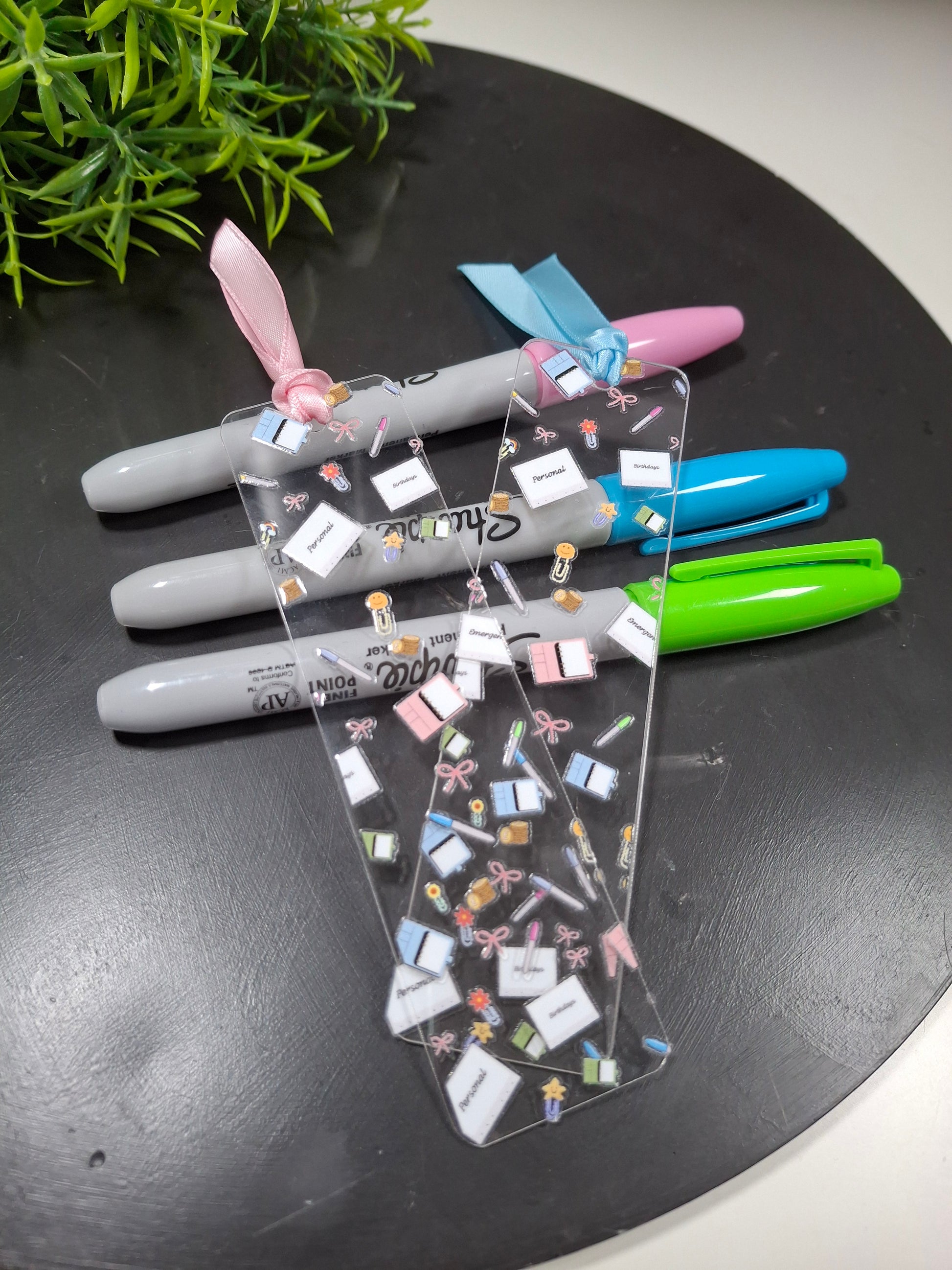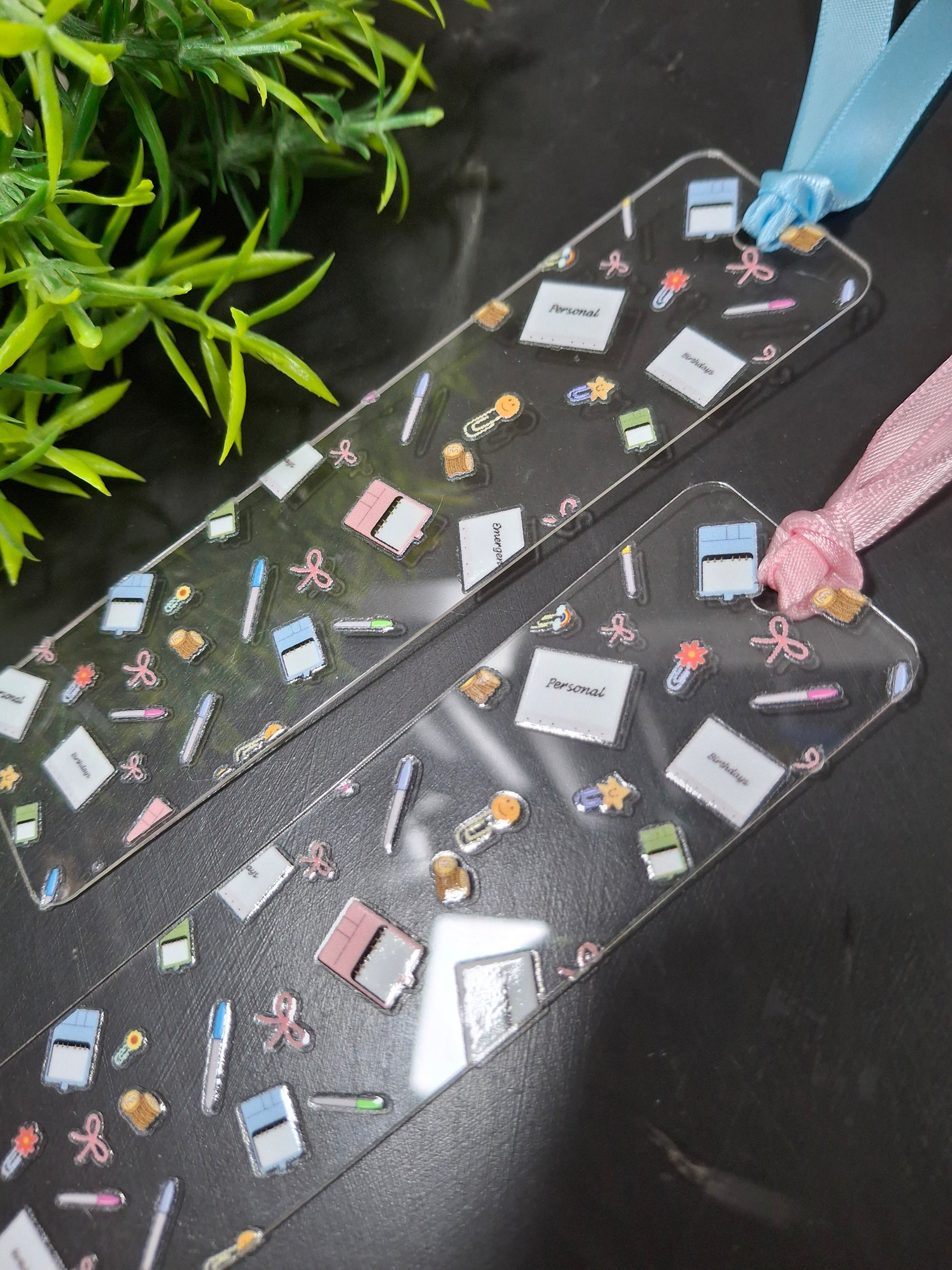 Acrylic bookmark with a cash stuffing themed UV DTF print complete with pink or blue ribbon